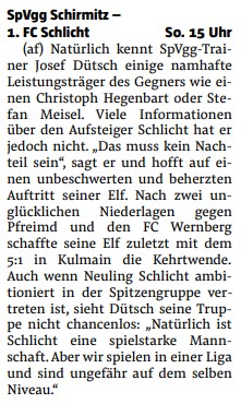 Nach dem überzeugenden Sieg beim SV Kulmain hofft de erste Mannschaft auch auf etwas Zählbares gegen den 1. FC Schlicht.